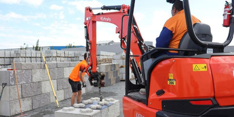 For larger concrete blocks like Stonebloc, heavy machinery like an excavator is needed for installation.