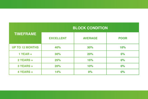 - The minimum price is calculated as a percentage of the original purchase price, quality, and age of the block as set out in the table below.