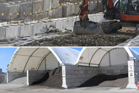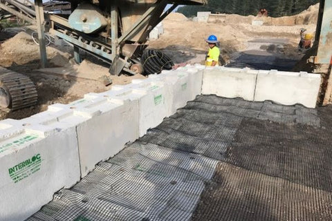 This method combines both the MSE system and the vertically reinforced system. Civil engineering contractors, Fulton Hogan, chose Interbloc for the storage of their asphalt material in Silverdale. With the equivalent of over 2000 tonnes of material, the Interbloc retaining walls utilised the MSE vertically reinforced wall by installing geogrids into the blocks during the manufacturing process. This meant Interbloc could prove its ability to allow a high surcharge capacity reinforced wall. The geogrid was then used in the backfill of soil behind the retaining wall and secured to the blocks.